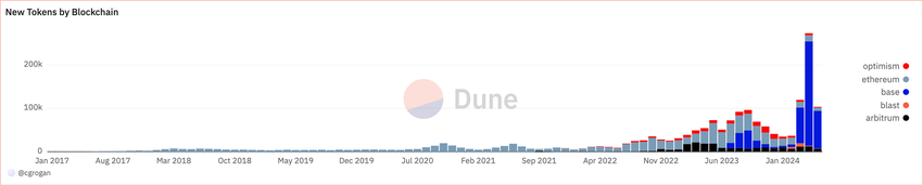 In particolare, l’886% dei nuovi token sulla blockchain di Ethereum, pari a 327.553, ha debuttato sulla rete layer-2 di Coinbase, Base. Questa piattaforma ha attirato molti sviluppatori, in particolare quelli che si concentrano sulle meme coin, grazie ai suoi costi operativi ridotti.