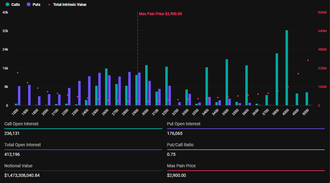 Oltre alle opzioni su Bitcoin, oggi scadono 412.116 contratti di opzioni su Ethereum. Queste opzioni in scadenza hanno un valore nozionale di 1,47 miliardi USD e un rapporto put-to-call di 0,75. Il punto di massimo dolore è 2.900 USD.
