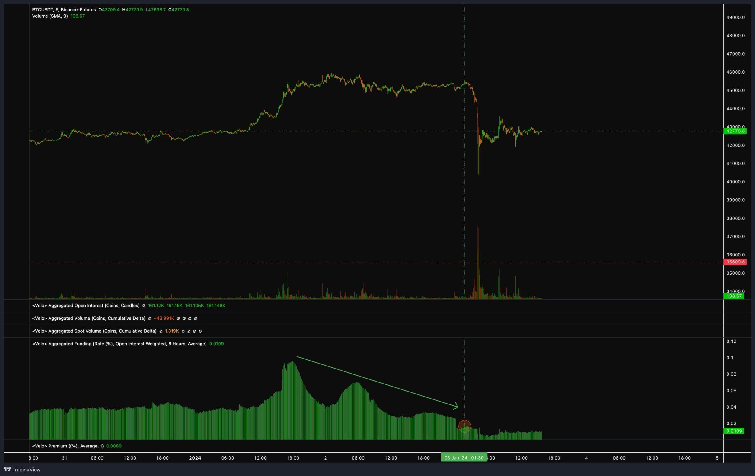 Ciò significa che l’interesse aperto dei derivati sulle criptovalute e i tassi di finanziamento erano già in calo prima dell’esplosione finale.