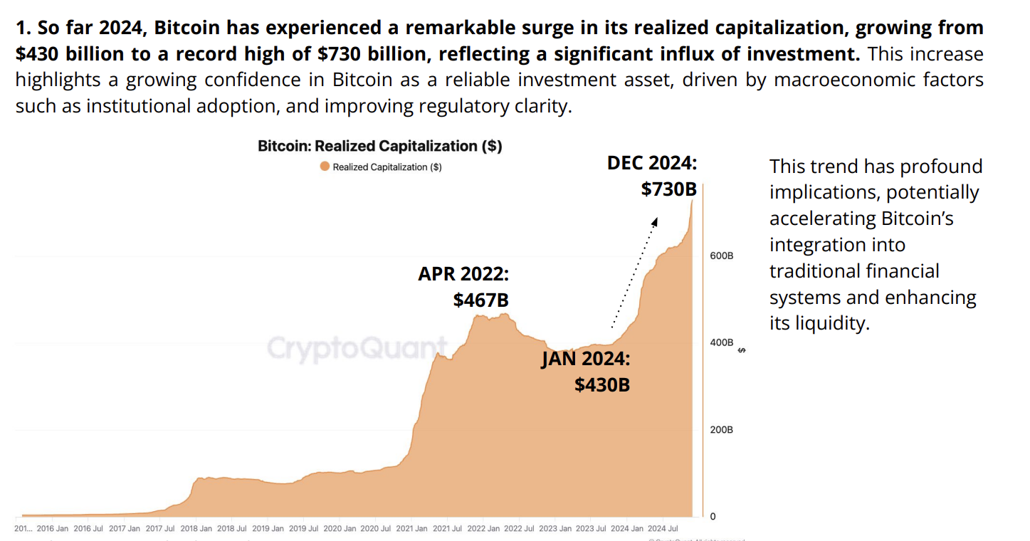 Una nuova analisi di CryptoQuant ha determinato che il 2024 è stato un “anno decisivo” per l’adozione istituzionale di Bitcoin, grazie agli exchange-traded funds (ETF). Gli investimenti aziendali sono aumentati in tutto il settore, incrementando la capitalizzazione realizzata di 300 miliardi USD.
