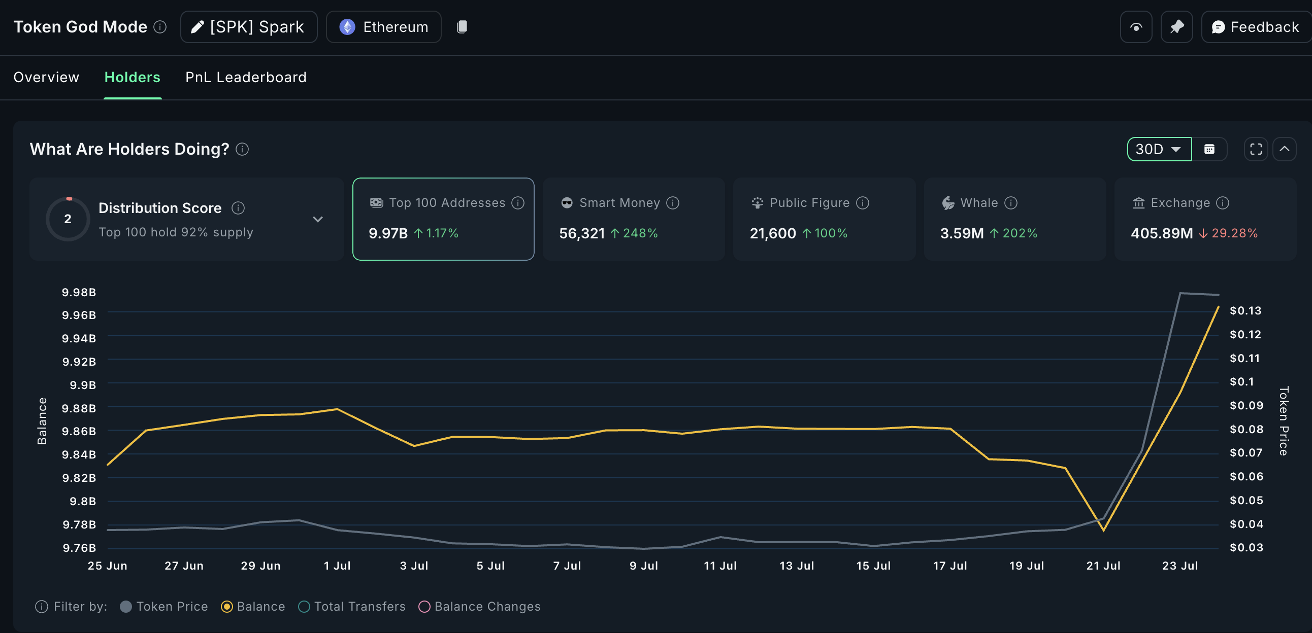 Spark (SPK) è il token nativo del protocollo Spark. Negli ultimi 30 giorni, SPK ha visto un aumento del 202% nelle partecipazioni delle balene, aumentando a 3,59 milioni di token. Con il prezzo attuale a $0,13, questo porta il totale delle partecipazioni delle balene a $466.700. Il prezzo di SPK ha seguito con un aumento di oltre 24% nelle ultime 24 ore.