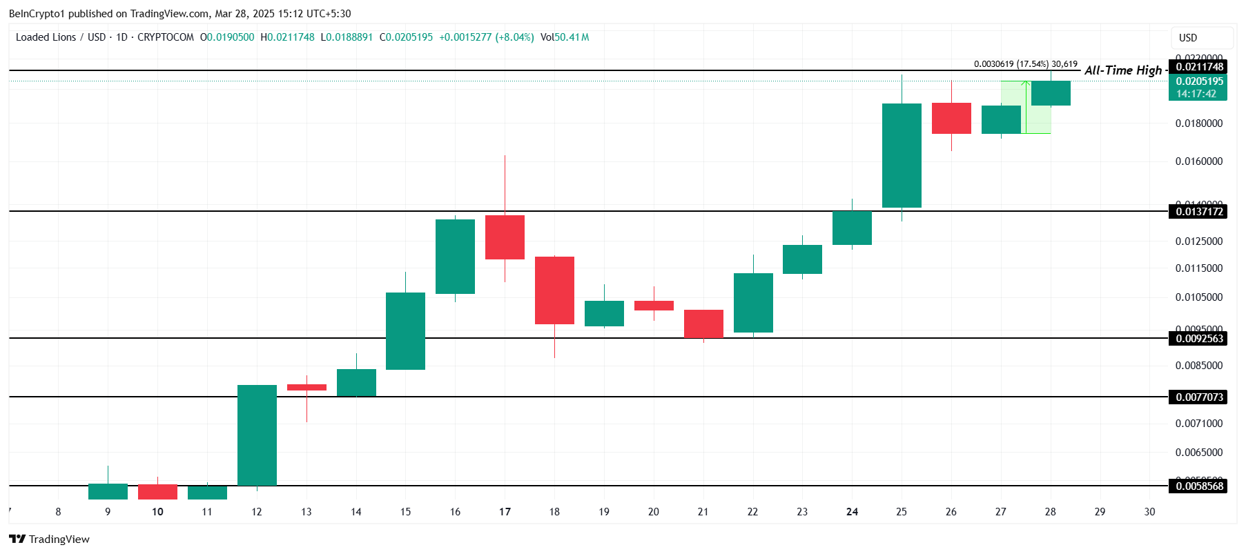 Questo segna il secondo massimo storico per LION questa settimana, segnalando che l’altcoin è probabile che continui il suo trend rialzista. Grazie allo slancio rialzista a supporta del prezzo, LION potrebbe presto raggiungere $0,0250 o più. Questo consoliderebbe la sua posizione come uno dei migliori performer, formando ulteriori massimi storici lungo il percorso.