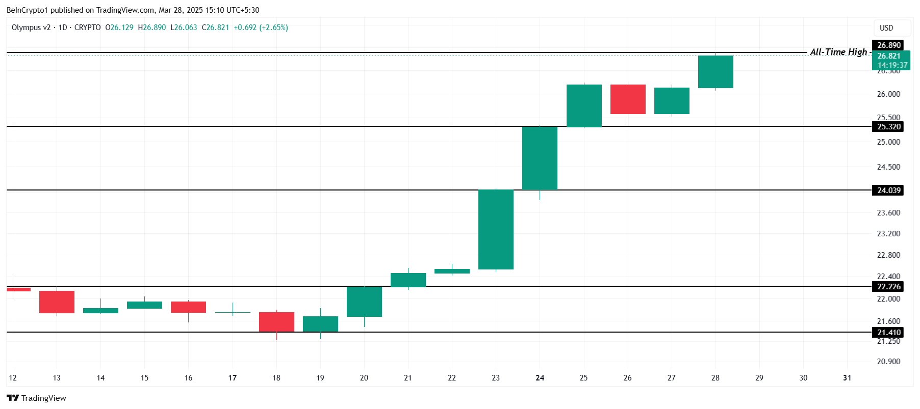Attualmente scambiato a $26,82, OHM è pronto per una ulteriore crescita, supponendo un continuo supporto degli investitori. Se il sentimento rialzista persistesse, OHM potrebbe salire a $30,00, estendendo i suoi recenti guadagni e creando nuovi massimi storici. L’altcoin ha mostrato un potenziale significativo, rendendolo un’opzione attraente per gli investitori a breve termine.