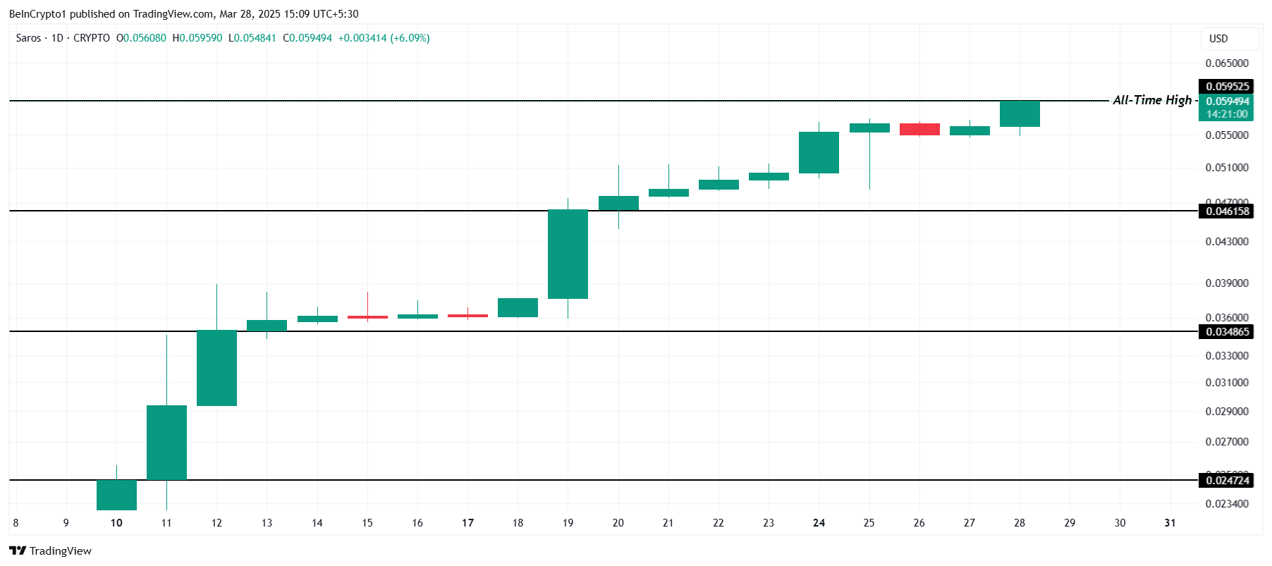 SAROS ha raggiunto un nuovo massimo storico a $0,0595 oggi, continuando il suo slancio verso l’alto. Questa crescita segue l’affermazione di $0,0461 come solido livello di supporto. La salita costante dell’altcoin riflette un crescente interesse degli investitori.