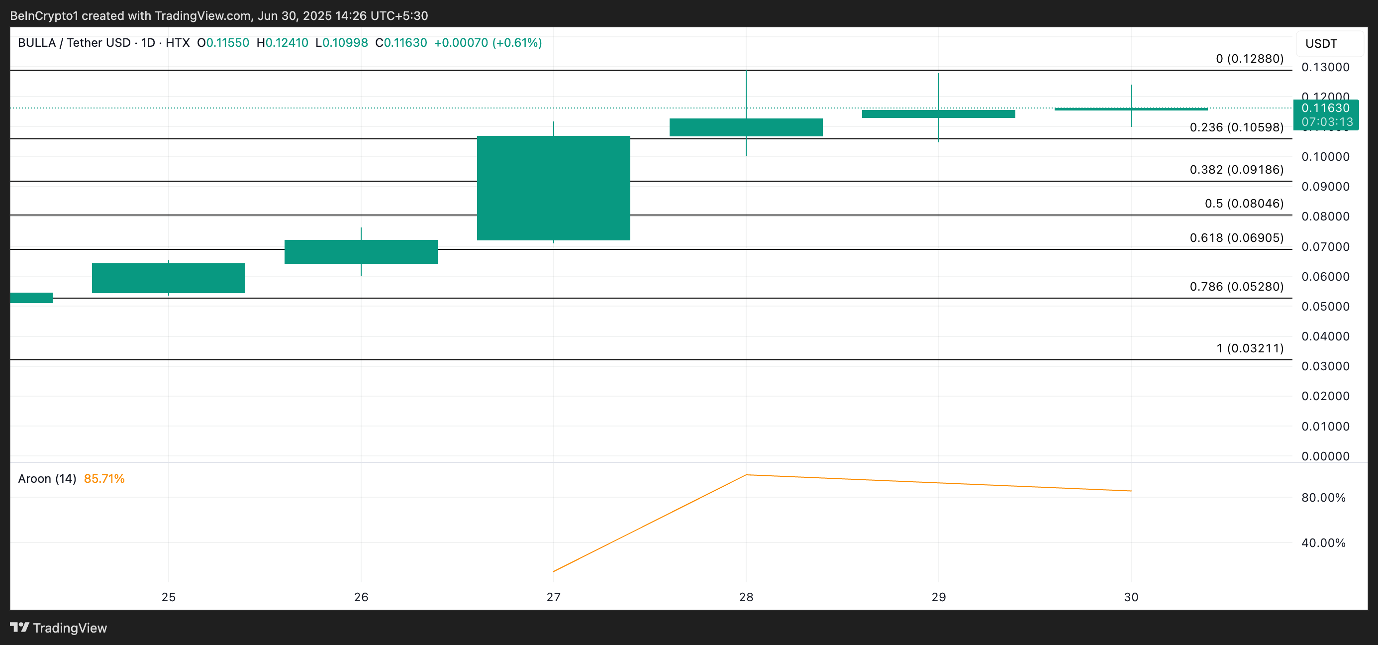 Sul grafico giornaliero BULLA/USD, la Aroon Up Line del token è all’85,71%, confermando la forza del rally. L’indicatore Aroon misura la forza e la direzione di un trend. Comprende due linee: Aroon Up, che traccia il momentum rialzista, e Aroon Down, che traccia la pressione ribassista.