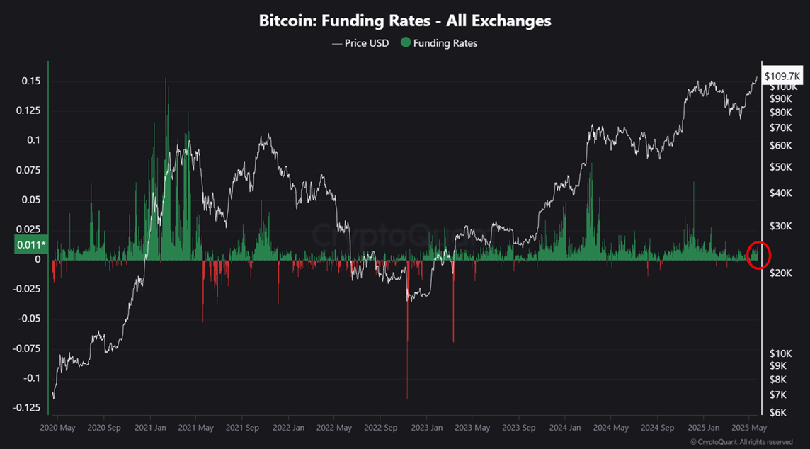 Secondo i dati di CryptoQuant, quando Bitcoin ha raggiunto il picco a marzo e dicembre 2024, il tasso di finanziamento è aumentato. Questo ha segnalato posizioni long eccessive e un mercato surriscaldato. Tali condizioni spesso portavano a correzioni di prezzo brusche successivamente.