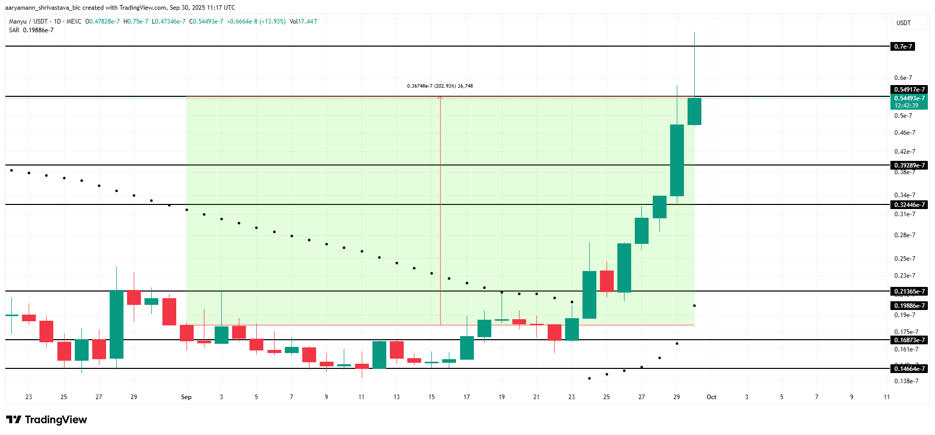 MANYU è diventata una delle meme coin di spicco di questo mese, registrando un enorme aumento del 203% dall’inizio di settembre. La sua capitalizzazione di mercato ora si attesta a $56 milioni. Il rally improvviso ha attirato l’attenzione dei trader, rendendo MANYU uno dei token più osservati nel crescente settore delle meme coin.