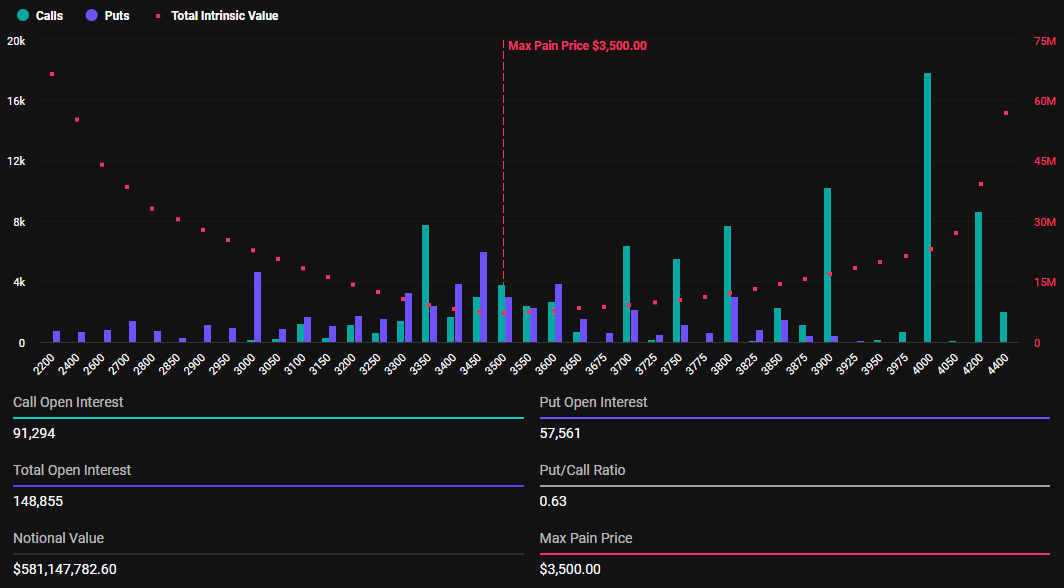 Secondo i dati di Deribit, oltre 148.733 contratti Ethereum scadranno oggi. Questi contratti in scadenza hanno un valore nozionale di circa 581 milioni USD, con un punto di massimo dolore di 3.500 USD. Ethereum ha visto un modesto aumento dello 0.73% dall’apertura della sessione di venerdì, per scambiare a 3.902 USD al momento della scrittura.