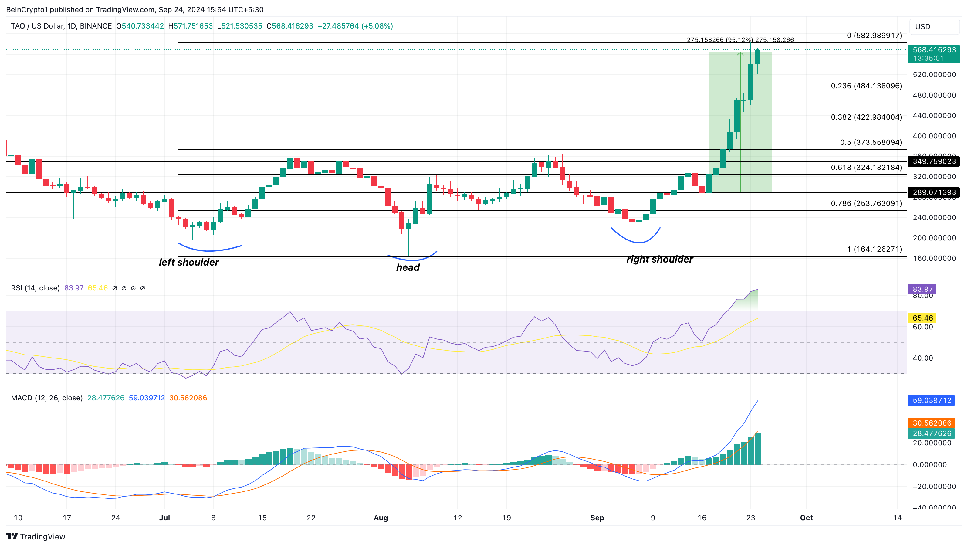 Da un punto di vista tecnico, il grafico giornaliero ha rivelato che la criptovaluta aveva precedentemente formato un pattern inverso testa-e-spalle. Questo pattern rialzista è stato cruciale per aiutare TAO a mantenere il supporto di 298,07 USD e a superare la resistenza di 349,75 USD.