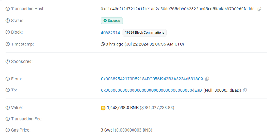 Si è verificata direttamente sulla Smart Chain di Binance (BSC) in mezzo alla BNB Chain Fusion in corso. È il primo di molti, con la corrispondente quantità di BNB inviata a questo indirizzo “buco nero”.