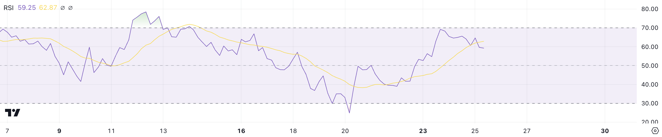 Sebbene l’RSI attuale rifletta ancora un momentum relativamente forte, il ritiro indica che il mercato potrebbe stabilizzarsi dopo un periodo di intensa attività d’acquisto.