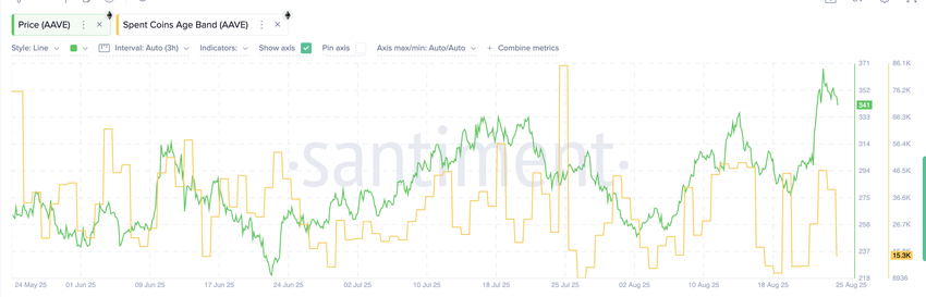 Un altro parametro da considerare è la fascia d’età delle monete spese. Questo indicatore traccia se le monete più vecchie vengono spese, il che spesso mostra pressione di vendita. Il 23 agosto, il totale delle monete spese era di 46.600 AAVE. Al momento della pubblicazione, era sceso a 15.230 AAVE — un calo di circa il 67%.