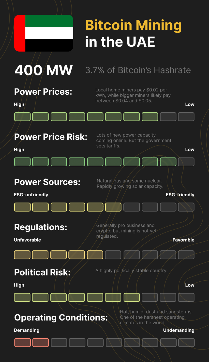 Nonostante questa regolamentazione, gli Emirati Arabi Uniti (EAU) rimangono pro-crypto. Nel 2023, il paese è emerso come un attore significativo nel panorama globale del mining di Bitcoin, con una capacità di mining combinata di Bitcoin di circa 400 megawatt, contribuendo a circa il 4% dell’hash rate globale di Bitcoin.