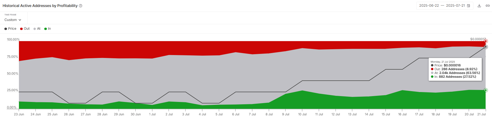 Osservando il macro momentum di Shiba Inu, il numero di indirizzi attivi per redditività rivela una tendenza preoccupante. Attualmente, circa il 27% degli indirizzi SHIB attivi sono in profitto. Questo è un livello critico perché, storicamente, una volta che la proporzione di indirizzi redditizi supera il 25%, le loro decisioni sono più propense a impattare il movimento del prezzo.