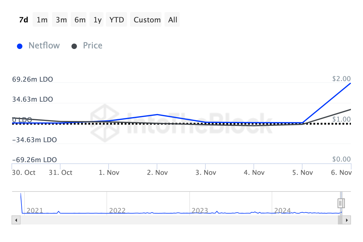 Questo aumento degli indirizzi attivi suggerisce un maggiore coinvolgimento degli utenti, che potrebbe supportare la recente tendenza al rialzo. Se questo slancio continua, il prezzo di LDO potrebbe registrare ulteriori guadagni.