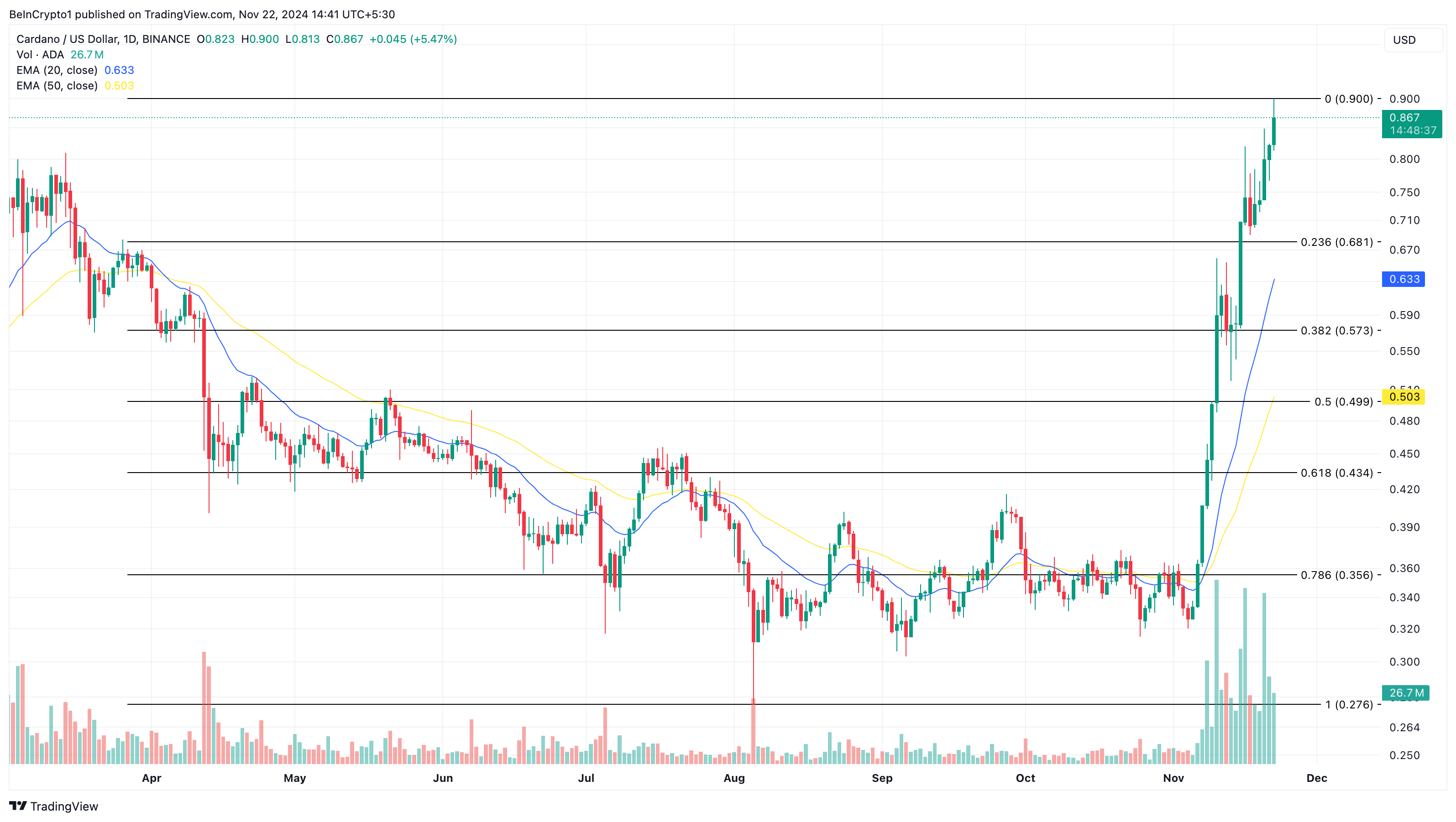 Nel grafico giornaliero, il prezzo di ADA è salito sopra le medie mobili esponenziali (EMA) chiave. Specificamente, la EMA a 20 giorni (blu) e la EMA a 50 giorni (gialla) sono sotto il prezzo di Cardano. Quando il prezzo è sopra l’indicatore, la tendenza è rialzista.