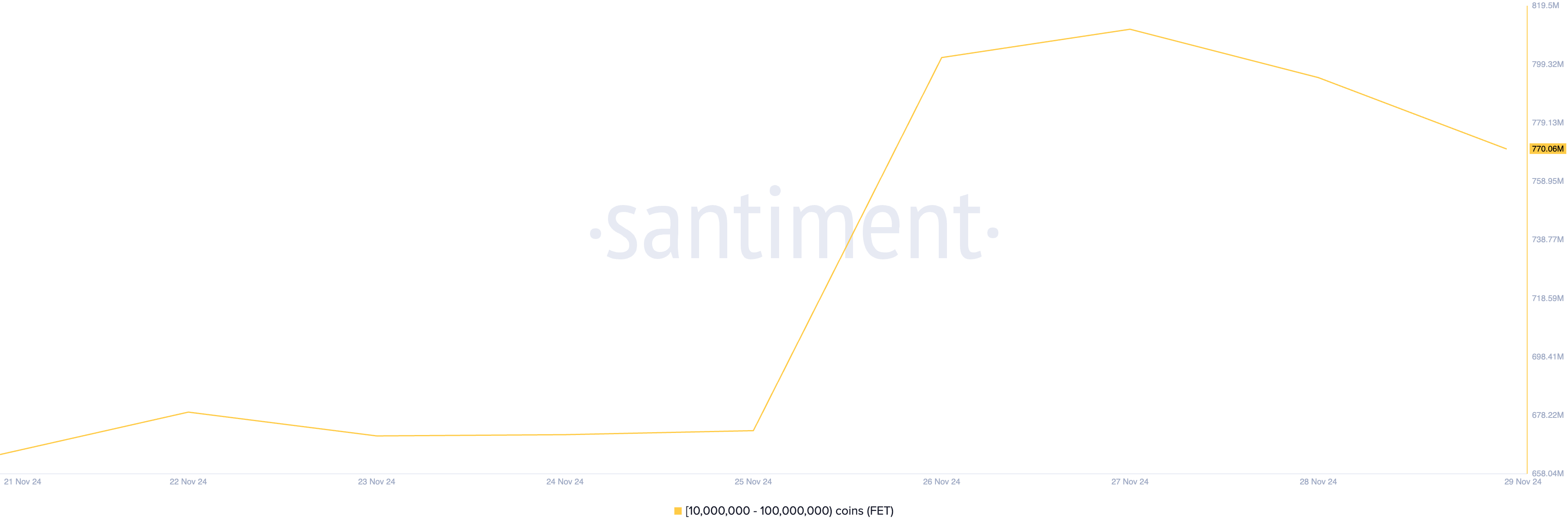 L’analisi di BeInCrypto della performance on-chain di FET ha rivelato un significativo aumento dell’accumulazione da parte delle whales nell’ultima settimana. I dati di Santiment rivelano che, negli ultimi sette giorni, gli indirizzi delle whales che detengono tra 10 milioni e 100 milioni di token FET hanno acquistato collettivamente 106 milioni di token valutati a 174 milioni USD ai prezzi di mercato attuali.