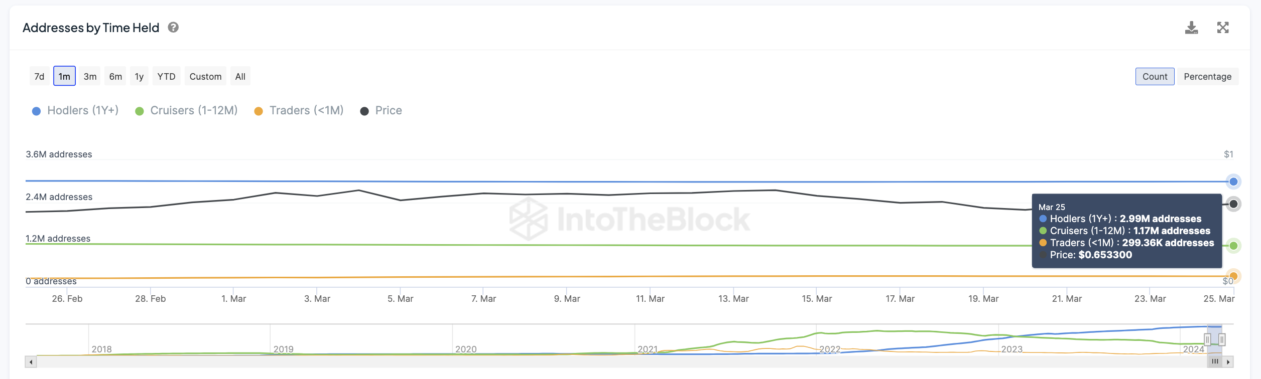 I trader, identificati come indirizzi che mantengono un asset per una durata inferiore a un mese, hanno visto un notevole aumento per ADA, con il loro numero che è passato da 244.000 il 1° febbraio a 303.000 il 18 marzo. Nello stesso arco di tempo, il prezzo di ADA è passato da 0,49 a 0,69 dollari.