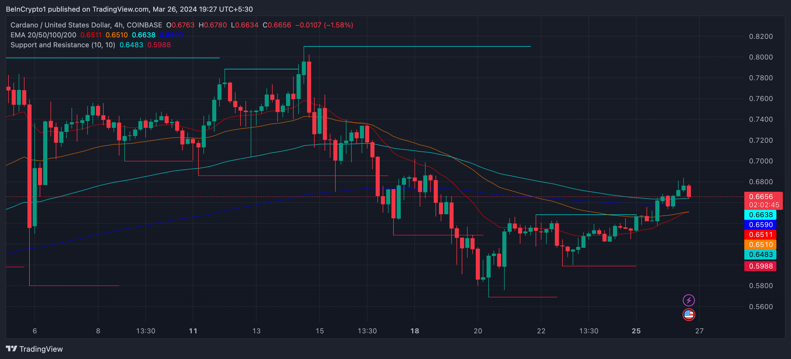 Il prezzo di ADA è cresciuto del 14,24% negli ultimi sei giorni. La domanda principale è: la tendenza al rialzo continuerà? Analizzando il grafico dei prezzi a 4 ore, vediamo che la linea dei prezzi è attualmente al di sopra di tutte le linee EMA (Exponential Moving Average), il che rappresenta un segnale rialzista.