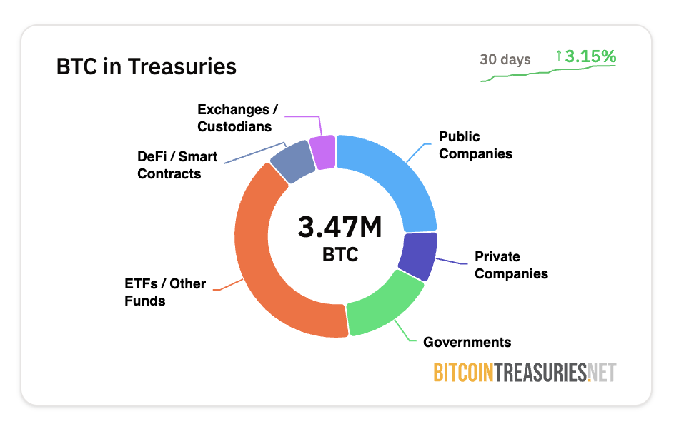 I dati più recenti da Bitcoin Treasuries hanno mostrato che le istituzioni possiedono un totale di 1.132.913 BTC, divisi tra 842.035 BTC (pubblici) e 290.878 BTC (privati). Questo ammonta a circa il 5,39% della fornitura totale. Strategy da sola detiene circa il 2,8% della fornitura totale di BTC.