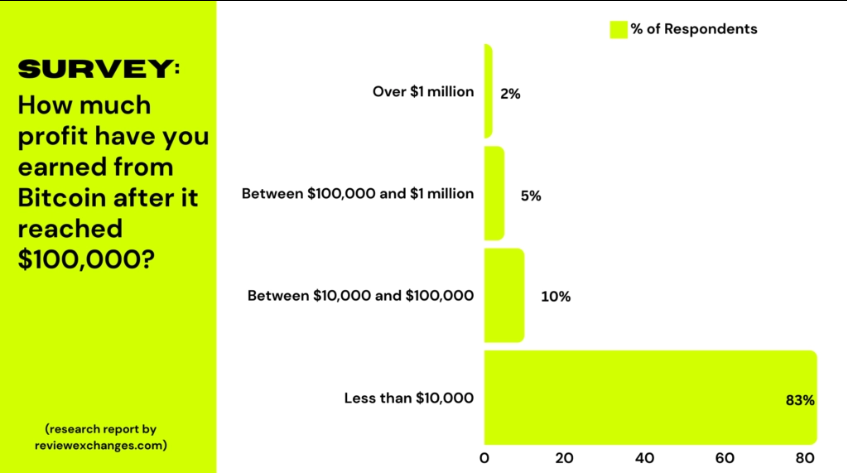 Il sondaggio ha anche mostrato che l’83% degli investitori ha guadagnato meno di 10,000 USD dal bull run, con solo il 2% che ha guadagnato oltre 1 milione USD. Questo riflette la rarità di guadagni sostanziali e sottolinea l’importanza del tempismo e della strategia.
