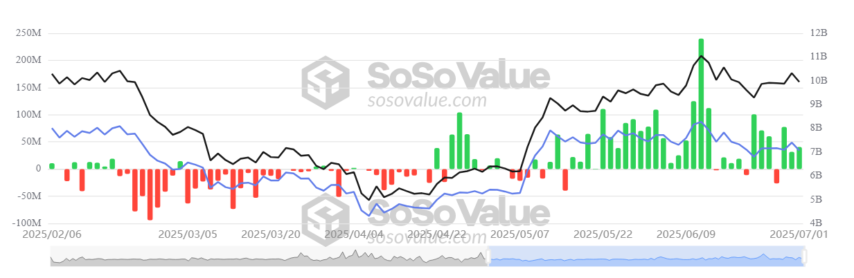 In particolare, il flusso netto di questi ETF su ETH è sceso da oltre $240 milioni l’11 giugno a poco più di $40 milioni il 1° luglio. Questo riflette un rallentamento del momentum di acquisto degli ETF.