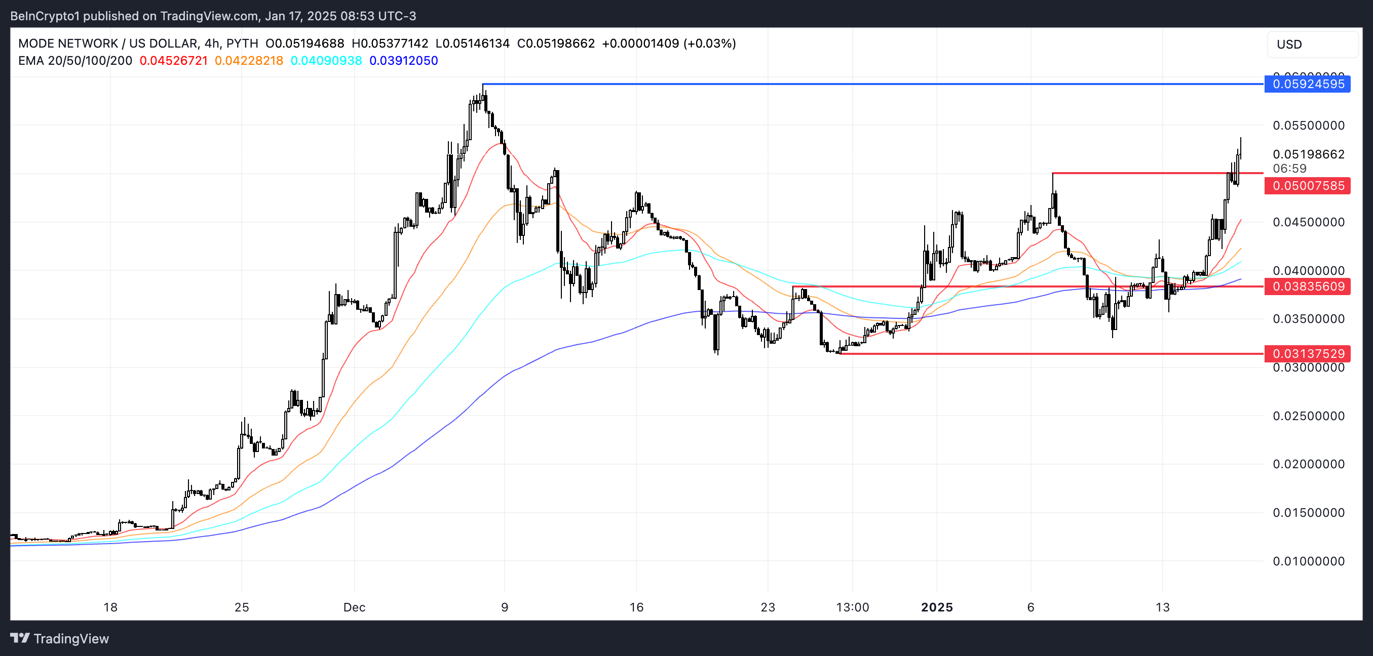 Se l’attuale slancio persiste, Mode potrebbe superare il suo precedente massimo storico, potenzialmente raggiungendo circa 0.059 USD. Tuttavia, se il rally perde forza, il livello di supporto a 0.05 USD sarà critico. Una violazione di questo supporto potrebbe vedere Mode ritornare a 0.038 USD o addirittura 0.031 USD.