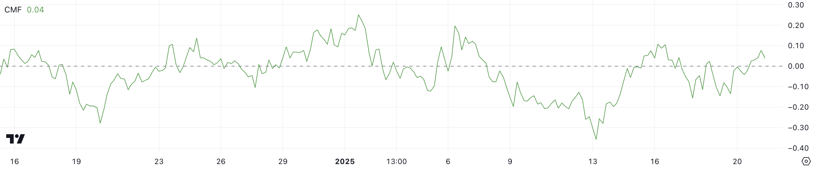 Il Chaikin Money Flow (CMF) è un indicatore tecnico utilizzato per misurare la forza del volume del flusso di denaro su un periodo specifico. I valori CMF variano tra -1 e 1, con valori positivi che indicano pressione d’acquisto netta e valori negativi che riflettono pressione di vendita netta.