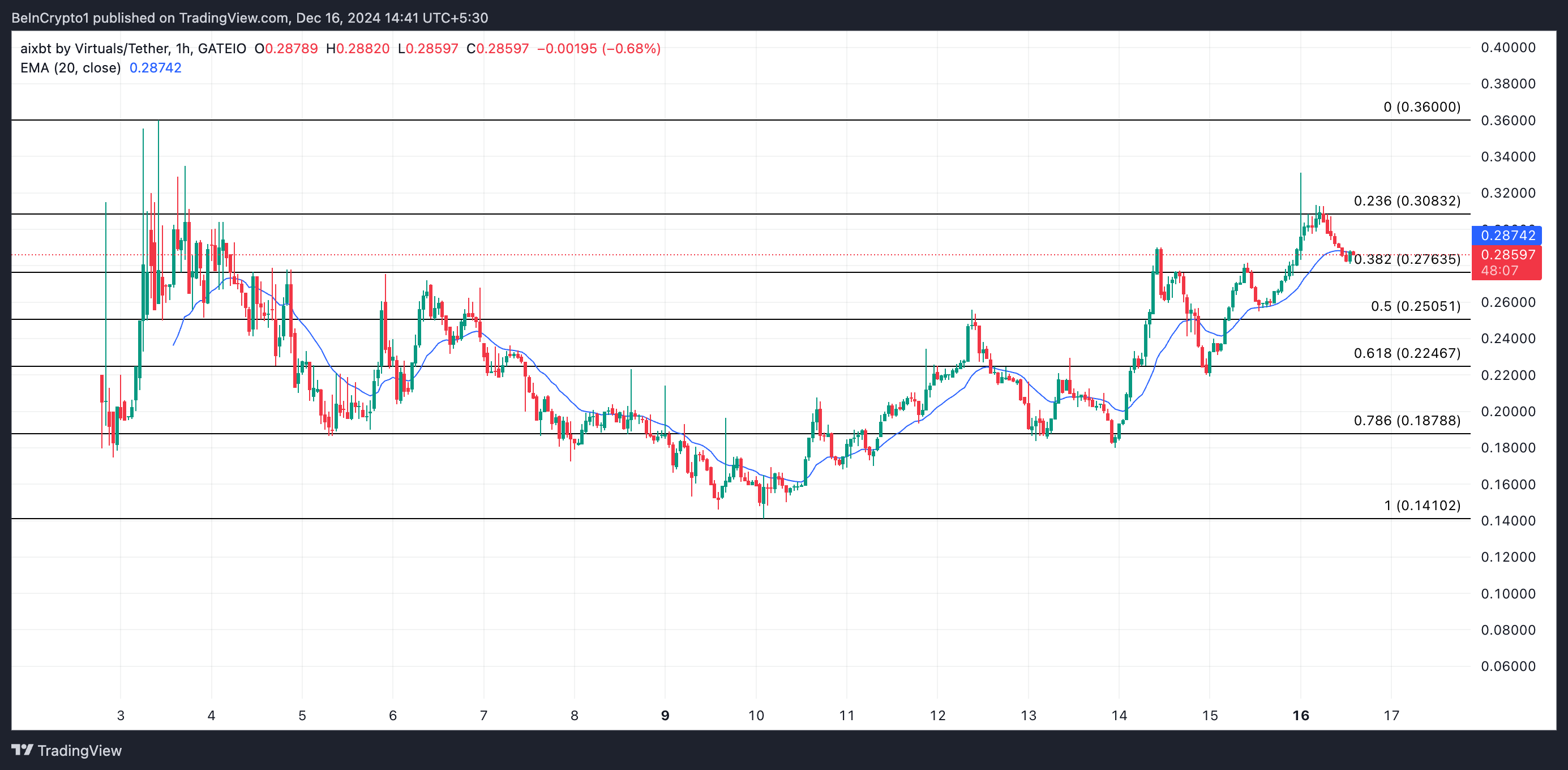 Il forte calo del prezzo di AIXBT è dovuto a un improvviso cambiamento nel sentimento del mercato. Un’analisi del grafico orario AIXBT/USD rivela che l’altcoin è brevemente salito sopra la sua media mobile esponenziale (EMA) a 20 giorni mentre si avvicinava al massimo storico di 0,36 USD. Tuttavia, con l’intensificarsi della pressione ribassista, il prezzo di AIXBT è tornato verso questa media mobile critica, dove attualmente viene scambiato.