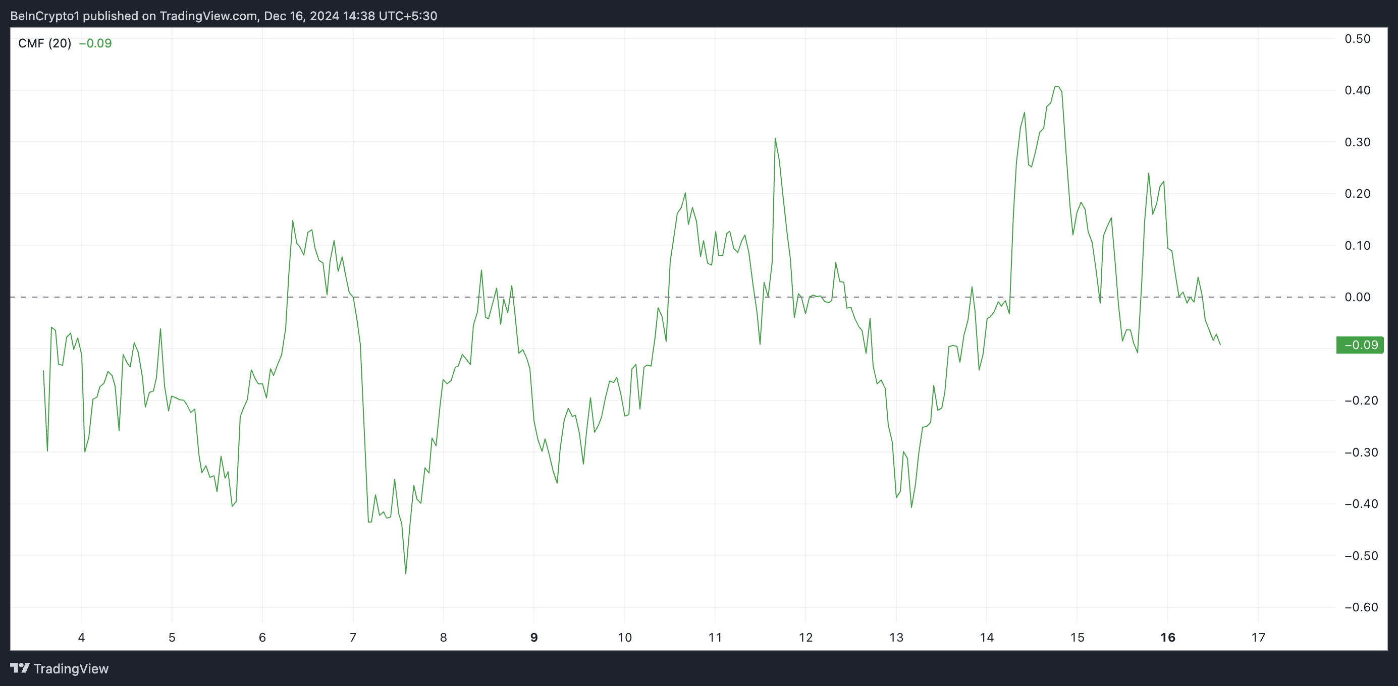 Il CMF è un indicatore che misura l’accumulazione e la distribuzione di un asset su un periodo specifico, tipicamente 20 o 21 giorni. Quando il CMF è negativo, la pressione di vendita supera quella d’acquisto, indicando un potenziale sentimento ribassista e una mancanza di forte domanda per l’asset.