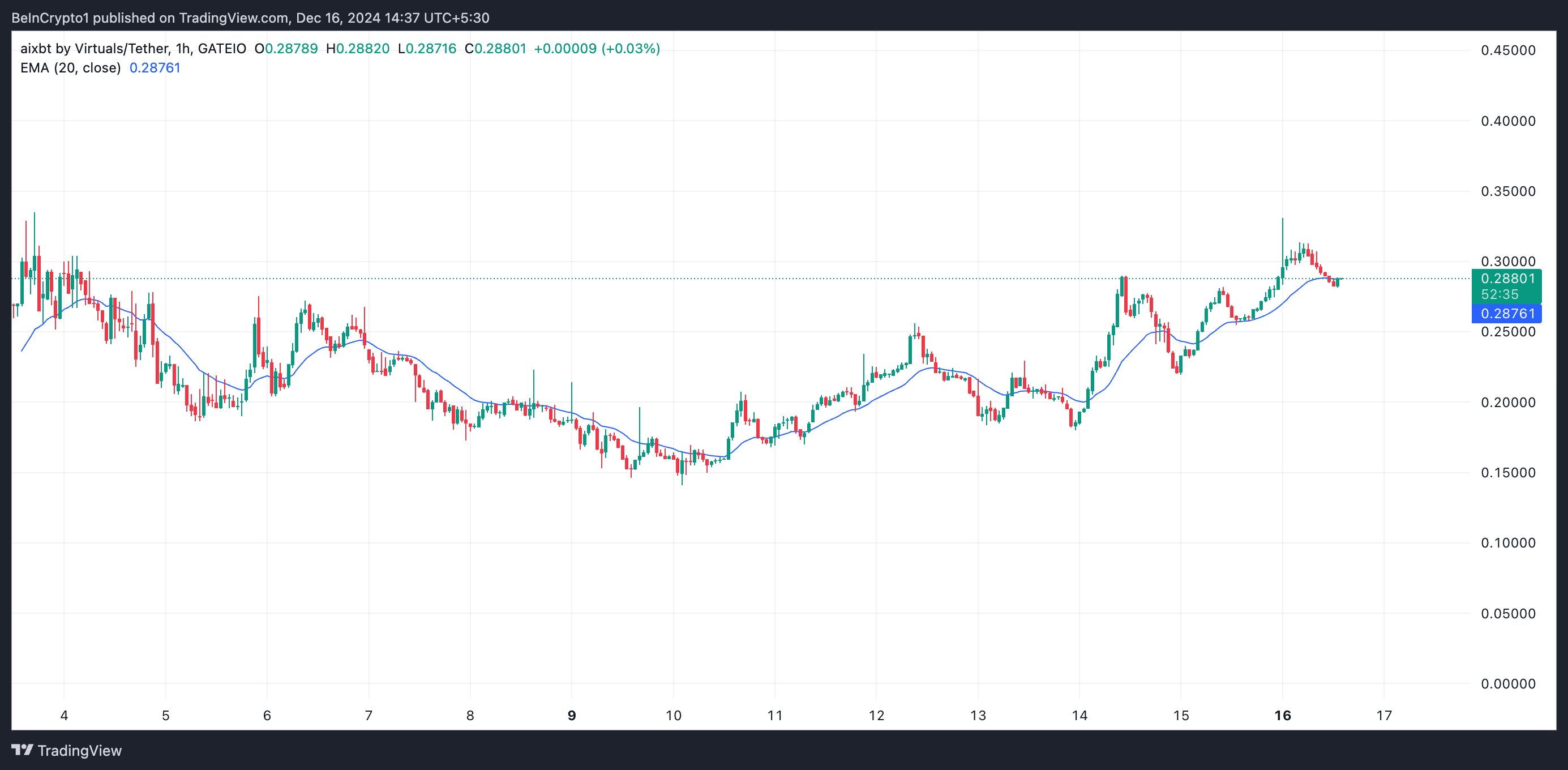 AIXBT ha visto un aumento significativo di valore durante la sessione asiatica di lunedì mattina, avvicinandosi al suo massimo storico di 0,36 USD. Tuttavia, ha raggiunto un picco di 0,33 USD prima di affrontare una serie di vendite, esercitando pressione al ribasso sul suo prezzo.