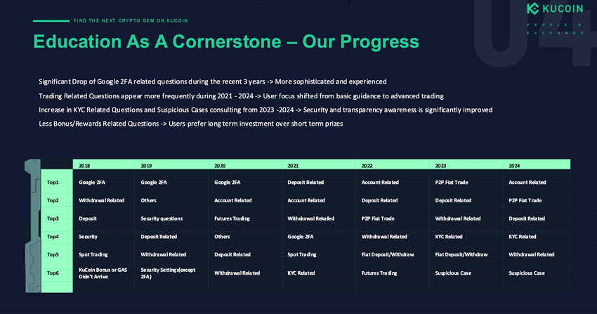 Alicia ha ulteriormente evidenziato che le domande riguardanti Google 2FA (autenticazione a due fattori) sono diminuite negli ultimi tre anni poiché gli utenti sono diventati più informati. Al contrario, le domande sul trading avanzato sono aumentate e hanno preso il loro posto. Infatti, le preoccupazioni degli utenti si sono spostate da ricompense a breve termine a strategie di investimento a lungo termine.