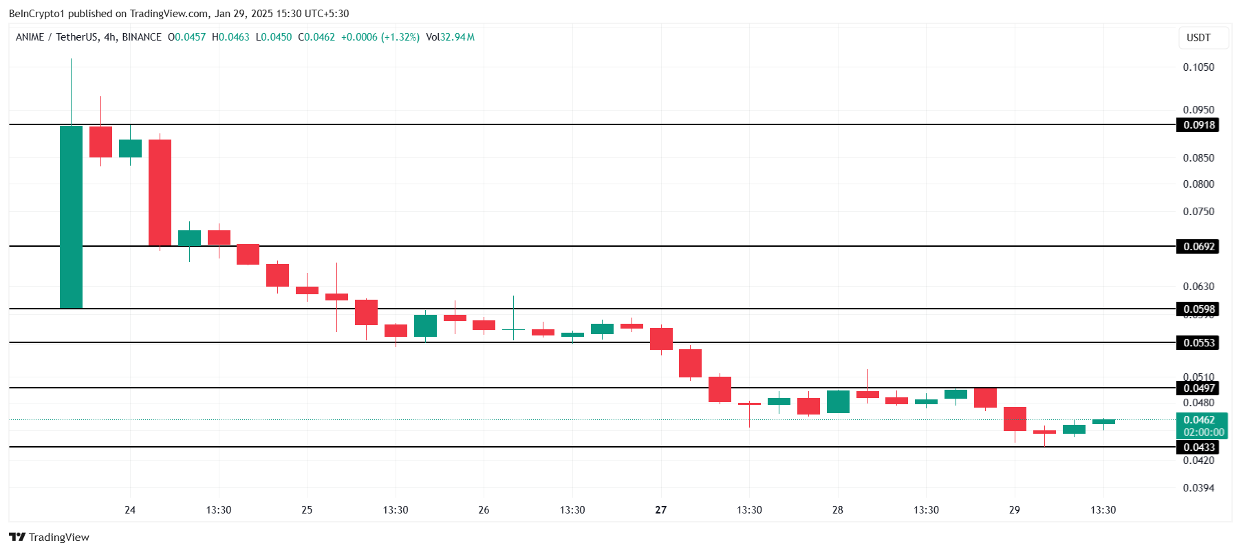 ANIME ha esteso il suo calo a meno di una settimana dalla sua quotazione, raggiungendo un nuovo minimo storico di 0.0433 USD. La persistente tendenza al ribasso evidenzia la debole fiducia degli investitori e la limitata pressione d’acquisto, mantenendo l’altcoin vulnerabile a ulteriori perdite nell’attuale contesto di mercato.