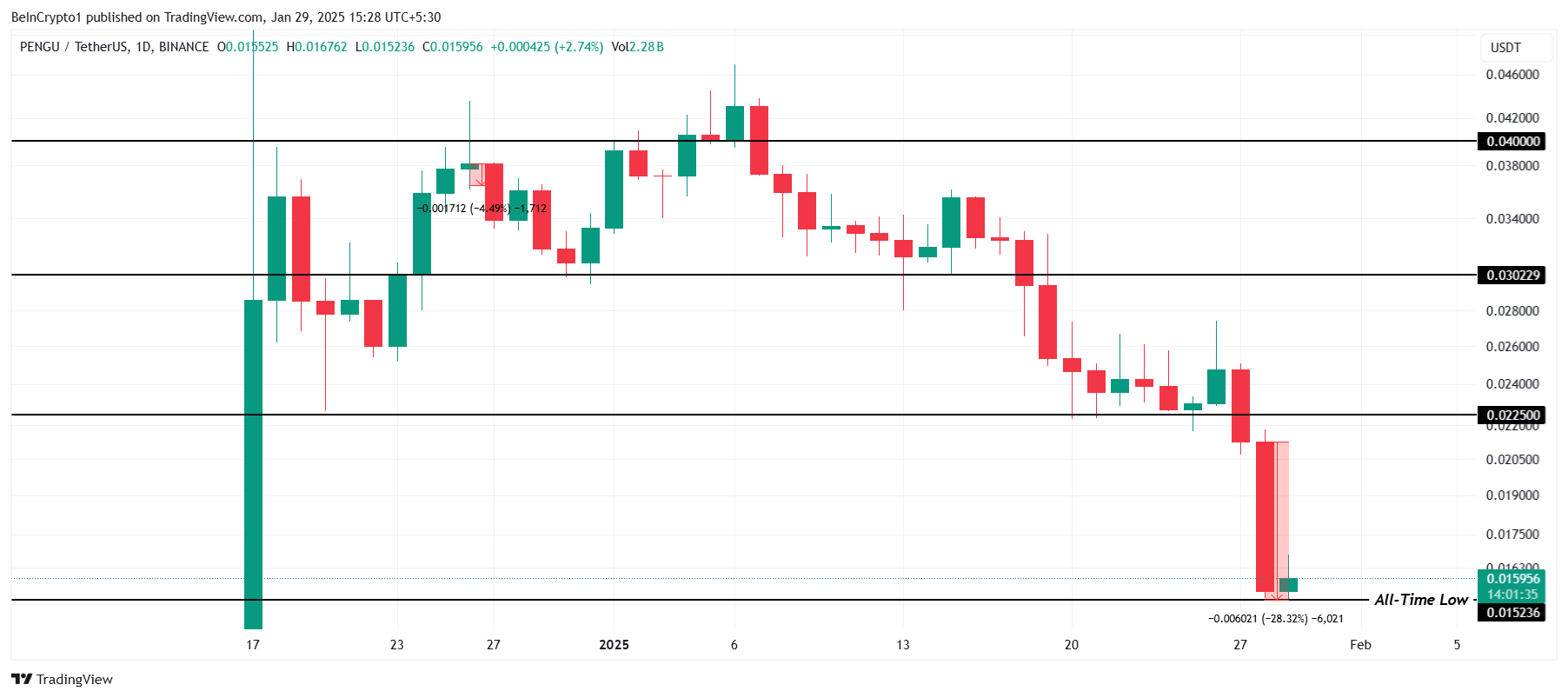 PENGU ha registrato un calo del 28% nelle ultime 24 ore, raggiungendo un nuovo minimo storico di 0.0152 USD durante il trading intraday. Questo persistente slancio ribassista evidenzia la lotta dell’altcoin per trovare stabilità, lasciando gli investitori cauti riguardo ai rischi di ulteriori ribassi nel breve termine.