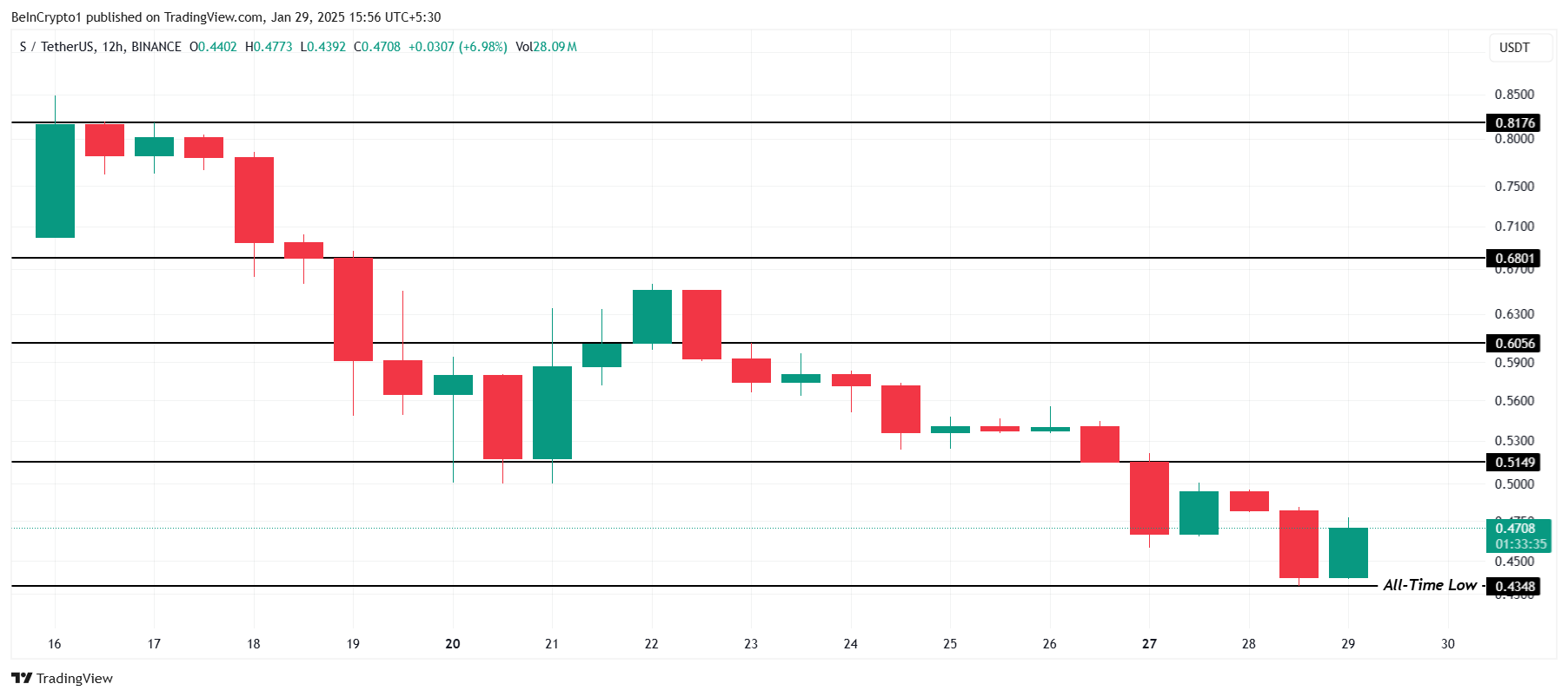 Nelle ultime 24 ore, il prezzo di Sonic ha registrato un recupero del 7%, portandolo a 0.4708 USD al momento della scrittura. Se il momentum ribassista continua, l’altcoin potrebbe scendere ulteriormente sotto 0.4348 USD, potenzialmente verso 0.4000 USD. La mancanza di un forte interesse d’acquisto suggerisce che l’altcoin rimane vulnerabile a ulteriori perdite nel breve termine.