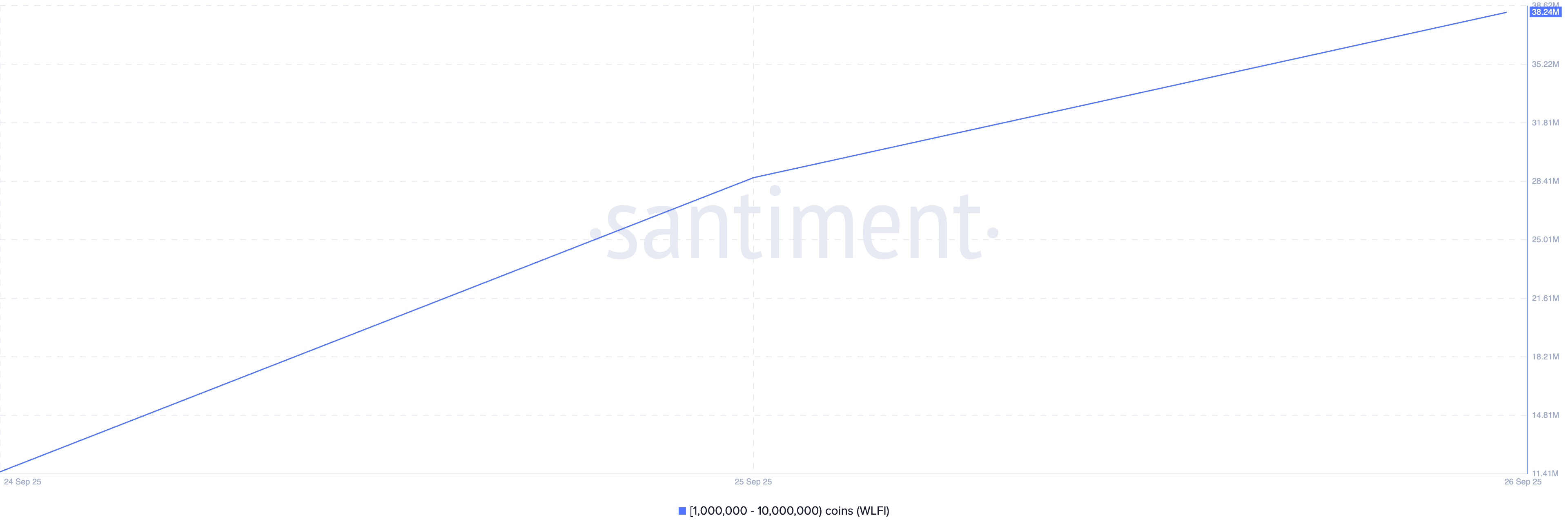 Secondo i dati on-chain di Santiment, gli indirizzi delle balene che detengono tra 1 milione e 10 milioni di token WLFI hanno aumentato le loro partecipazioni di 26,72 milioni durante la settimana in esame.