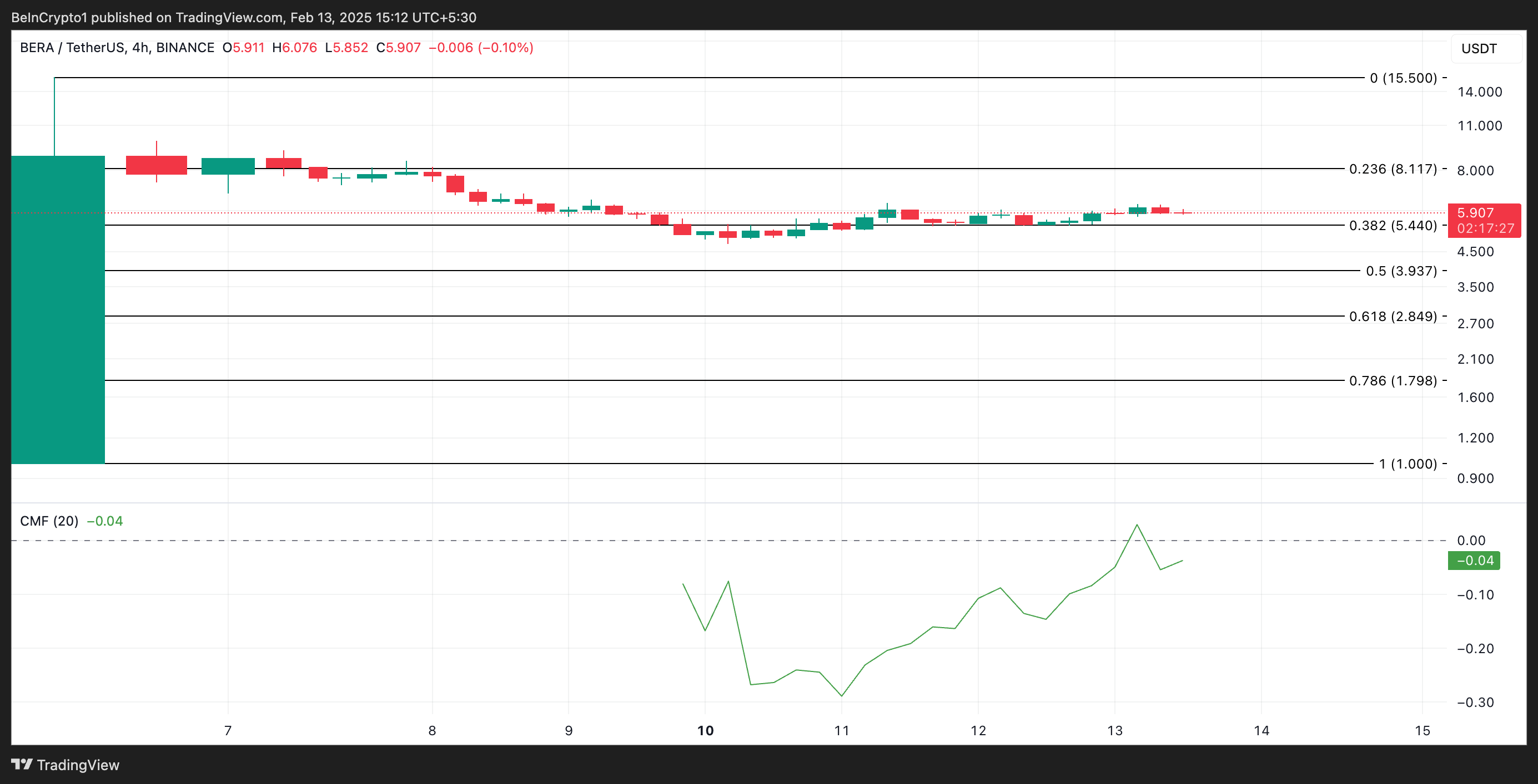 Tuttavia, il suo Chaikin Money Flow (CMF) negativo sul grafico a quattro ore segnala una divergenza ribassista, suggerendo una potenziale correzione del prezzo nel breve termine. Al momento della stampa, il CMF di BERA è sotto zero a -0,04.