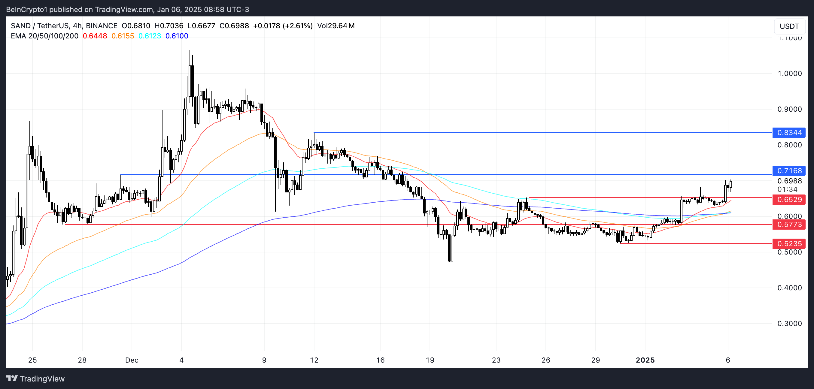 Se il momentum positivo continua, SAND potrebbe salire per testare la resistenza a 0.71 USD. Un breakout riuscito sopra questo livello potrebbe aprire la strada a ulteriori guadagni, con 0.83 USD come prossimo obiettivo chiave.