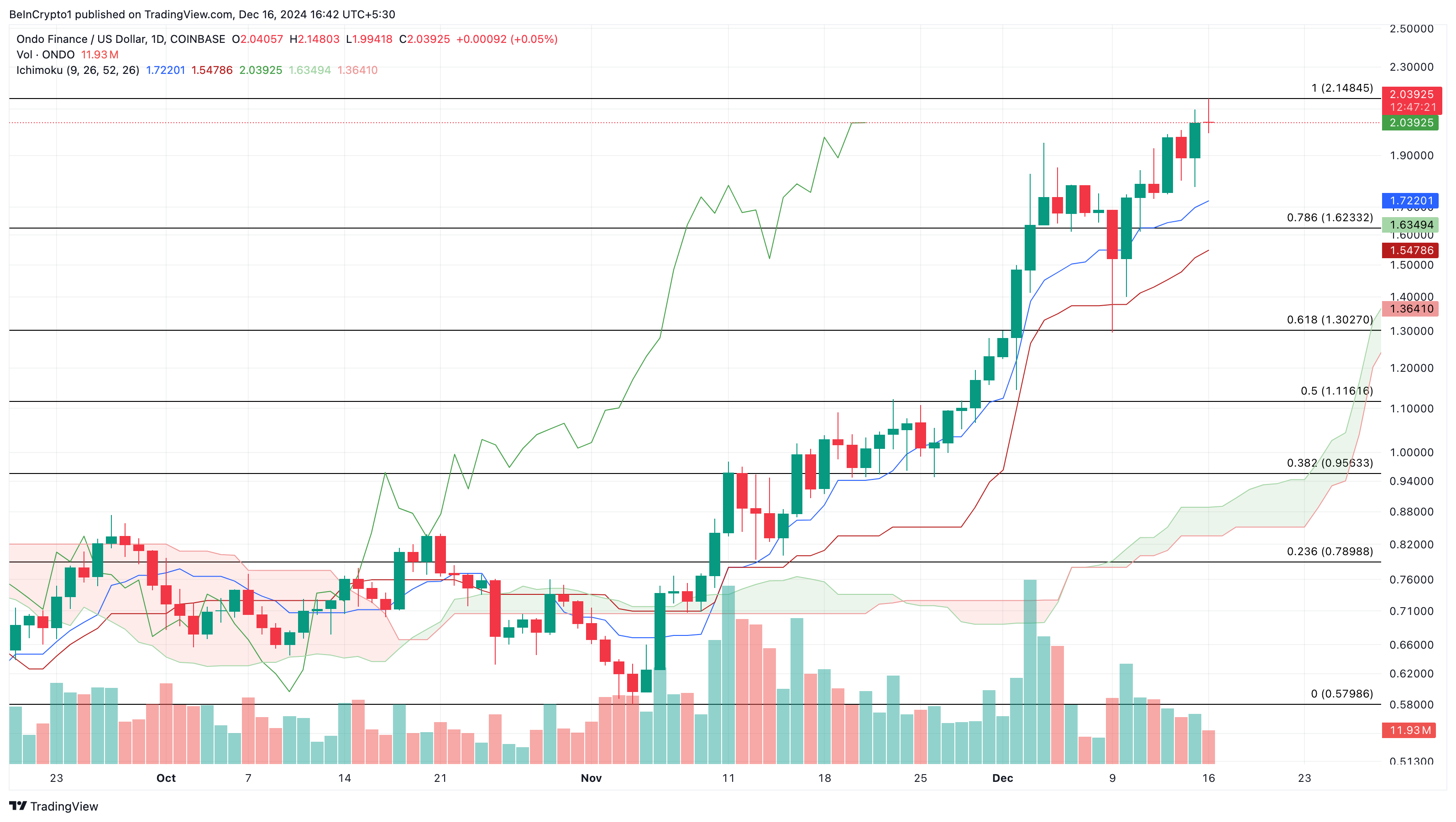 Sponsored SponsoredL’aumento del prezzo di ONDO potrebbe essere collegato alla notevole accumulazione di whale della scorsa settimana. Di conseguenza, il token ha superato il traguardo dei 2 USD. Da un punto di vista tecnico, il grafico ONDO/USD mostra che la Ichimoku Cloud è sotto il prezzo.