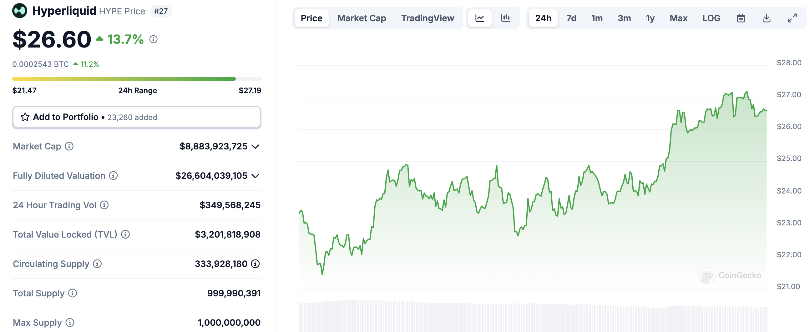 Nelle ultime 24 ore, il prezzo di HYPE è aumentato del 13,70%. Questo aumento ha portato la sua performance totale dal suo lancio sul mercato al 735%. Come risultato di questa performance, la capitalizzazione di mercato di Hyperliquid è vicina a raggiungere i 10 miliardi USD.