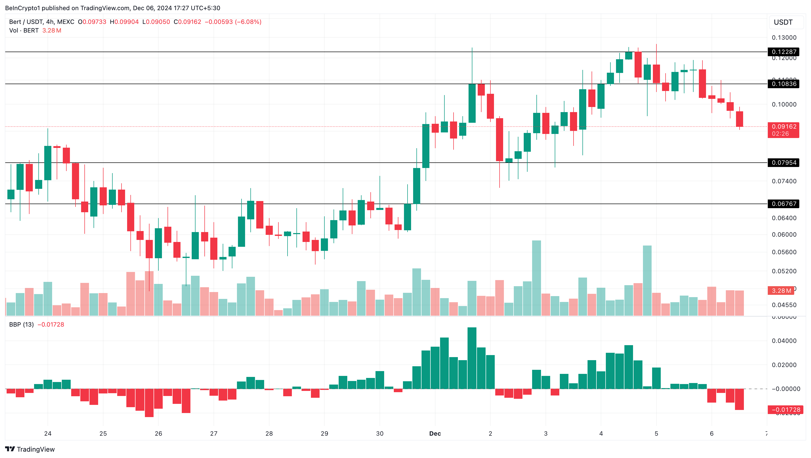 Se questo continua, il prezzo di BERT potrebbe scendere a 0.080 USD. Se la pressione di vendita aumenta, il token potrebbe scendere a 0.068 USD. D’altra parte, se i rialzisti eliminano i ribassisti, questa tendenza potrebbe cambiare e BERT potrebbe salire verso 0.12 USD.