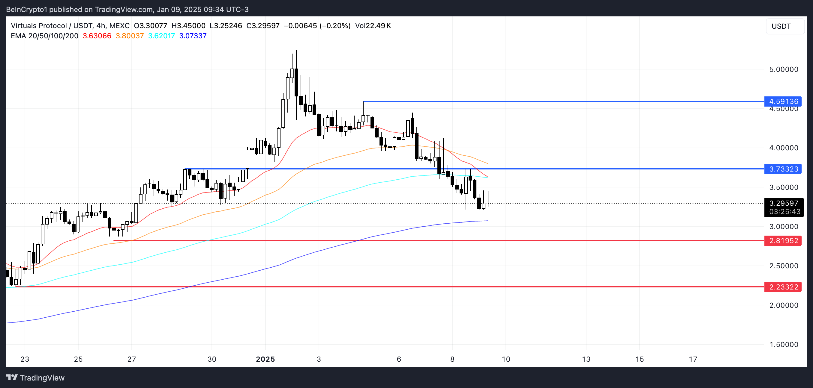 L’analisi del prezzo suggerisce che la correzione potrebbe approfondirsi, poiché le sue linee EMA a breve termine si avvicinano a una potenziale formazione di death cross incrociando sotto le EMA a lungo termine. Questo segnale ribassista potrebbe spingere il prezzo di VIRTUAL a testare il livello di supporto chiave a 2.81 USD, con un ulteriore calo a 2.23 USD se il supporto fallisce. Tuttavia, l’entusiasmo in corso attorno alle monete AI presenta un’opportunità per un’inversione.