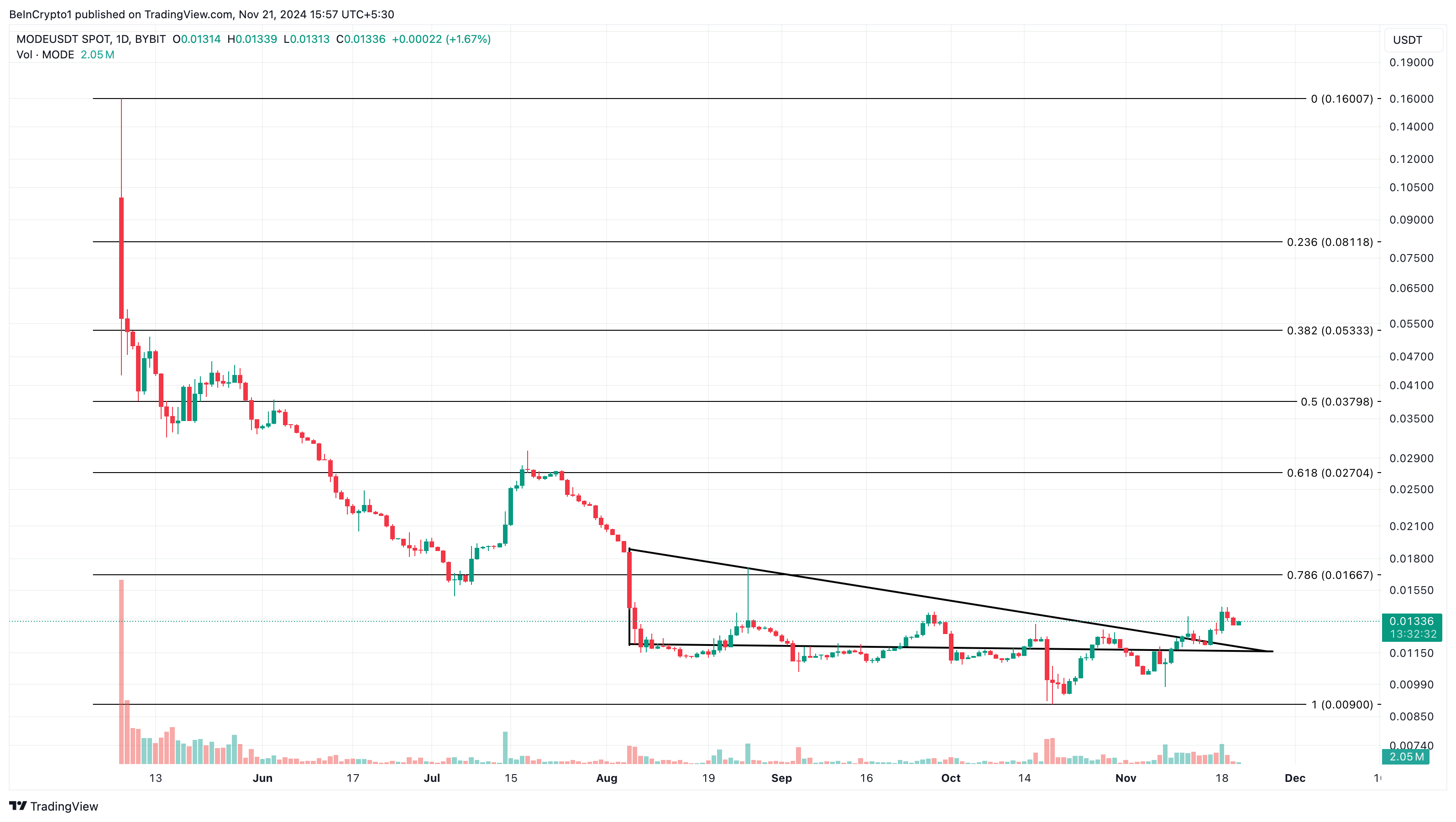 Ad esempio, nelle ultime 24 ore, il volume di scambio è aumentato a 700.000 USD. Tuttavia, il prezzo è rimasto intorno alla stessa regione a 0,13 USD. Nonostante il calo, il grafico giornaliero mostra che il prezzo di MODE è uscito da un triangolo discendente.