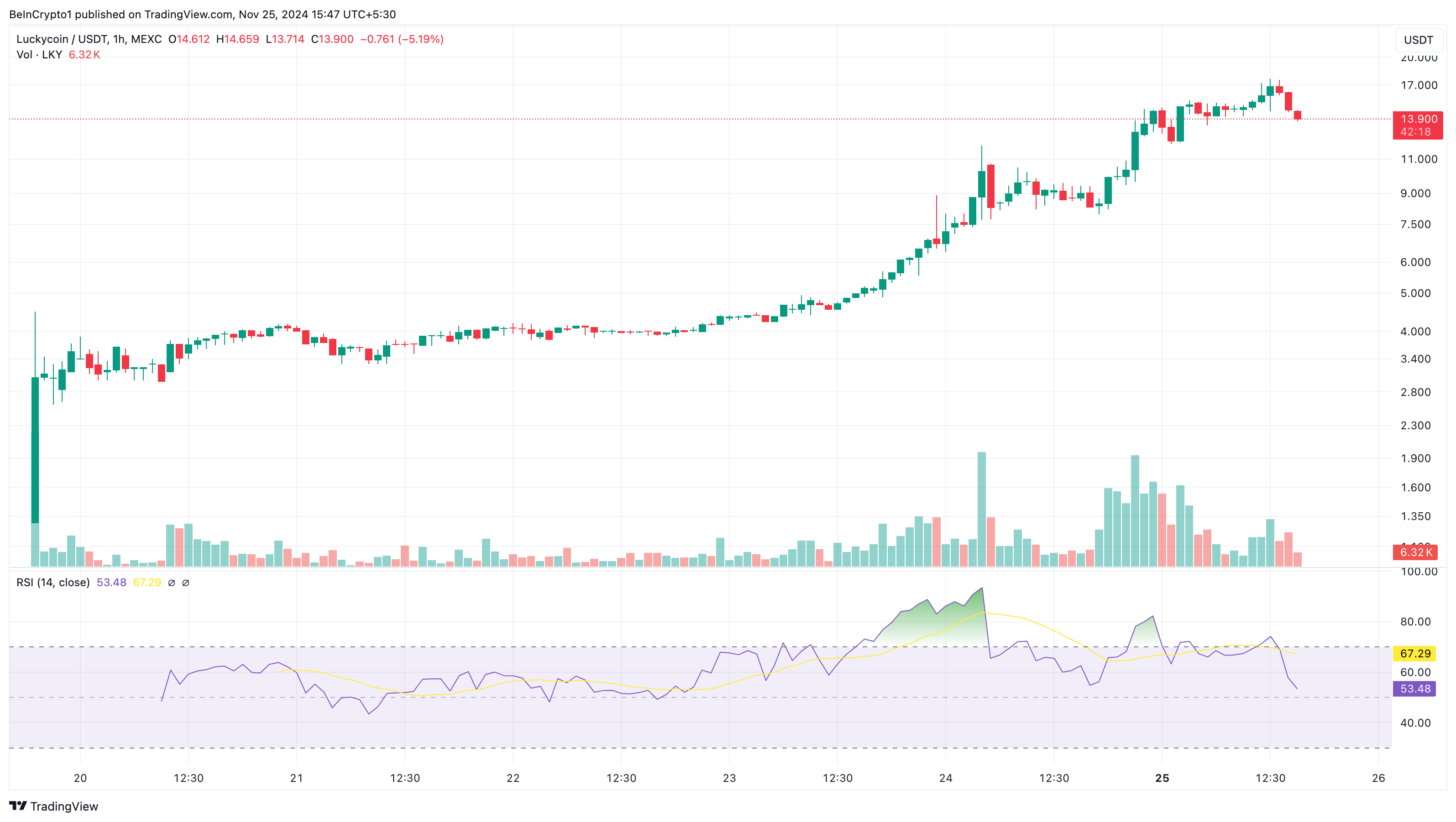 LKY è in tendenza oggi grazie a un’azione di prezzo impressionante. Scambiato a 13,90 USD, il suo prezzo è aumentato del 65% nelle ultime 24 ore e del 420% negli ultimi sette giorni. Questo rapido aumento è probabilmente alimentato dalla pressione d’acquisto, soprattutto dato che l’altcoin ha una fornitura totale limitata di soli 12,07 milioni di monete.