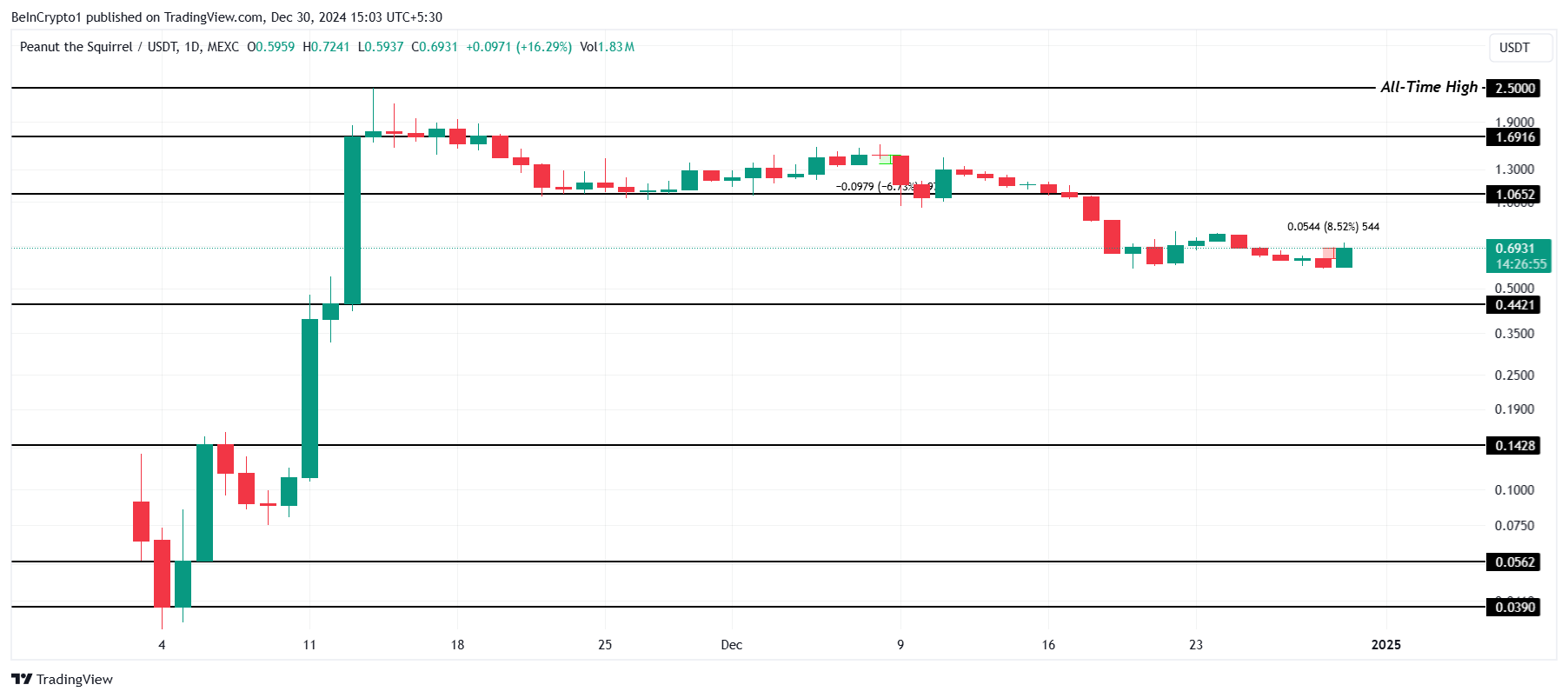 Il memecoin una volta rialzista PNUT ha preso una pausa, scendendo a 0.69 USD nonostante un aumento di 8% nelle ultime 24 ore. Tuttavia, l’altcoin ha ancora bisogno di recuperare dalle recenti perdite e riguadagnare slancio per mantenere l’interesse degli investitori.