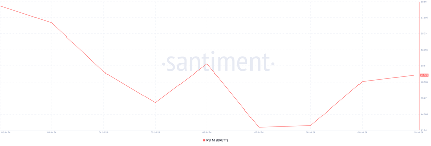 A causa del calo generale dell’attività sul mercato delle altcoin, la domanda di BRETT da parte degli operatori di mercato è diminuita nelle ultime settimane. Misurata dal suo Indice di Forza Relativa (RSI), la metrica sul blockchain mostra che la pressione di vendita di BRETT supera attualmente tutte le attività di acquisto. Al momento in cui scriviamo, il valore della metrica è inferiore alla linea di neutralità 50 a 49,52.