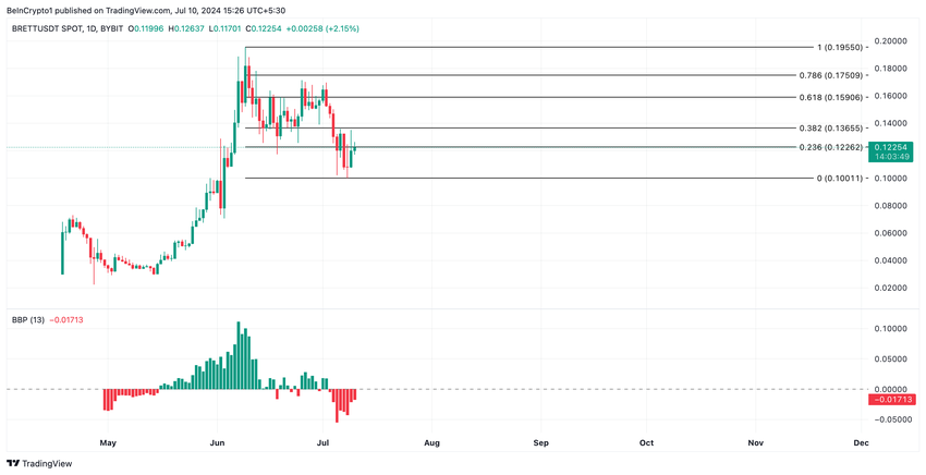 Definita la migliore amica di Pepe (PEPE) sul blockchain, Brett (BRETT) è l’altcoin con le maggiori perdite negli ultimi sette giorni. Scambiata a 0,12 dollari al momento della stampa, il valore dell’altcoin è crollato del 23% nell’ultima settimana.