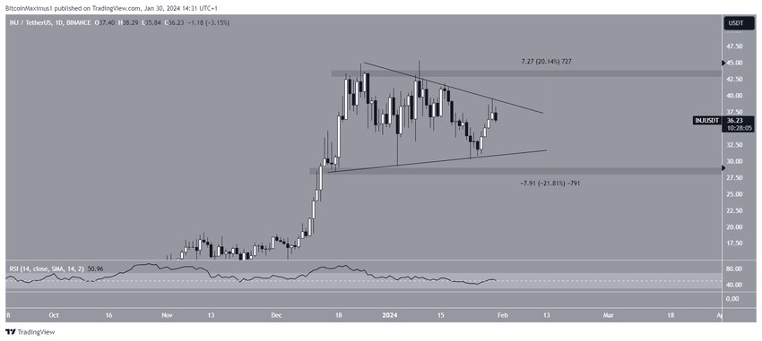 Il prezzo di INJ scambia all’interno di un triangolo simmetrico a lungo termine dal 24 dicembre 2023. Il triangolo simmetrico è considerato un modello neutrale, che può portare sia a breakout che a breakdown.