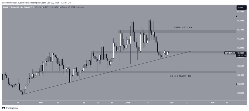 Il prezzo di RDNT è aumentato a fianco di una linea di tendenza ascendente di supporto dall’ottobre 2023. Più recentemente, ha rimbalzato sulla linea di tendenza nel gennaio 2024 (icona verde). Tuttavia, il rimbalzo si è indebolito e RDNT scambia sotto l’area di resistenza di 0,29 dollari.