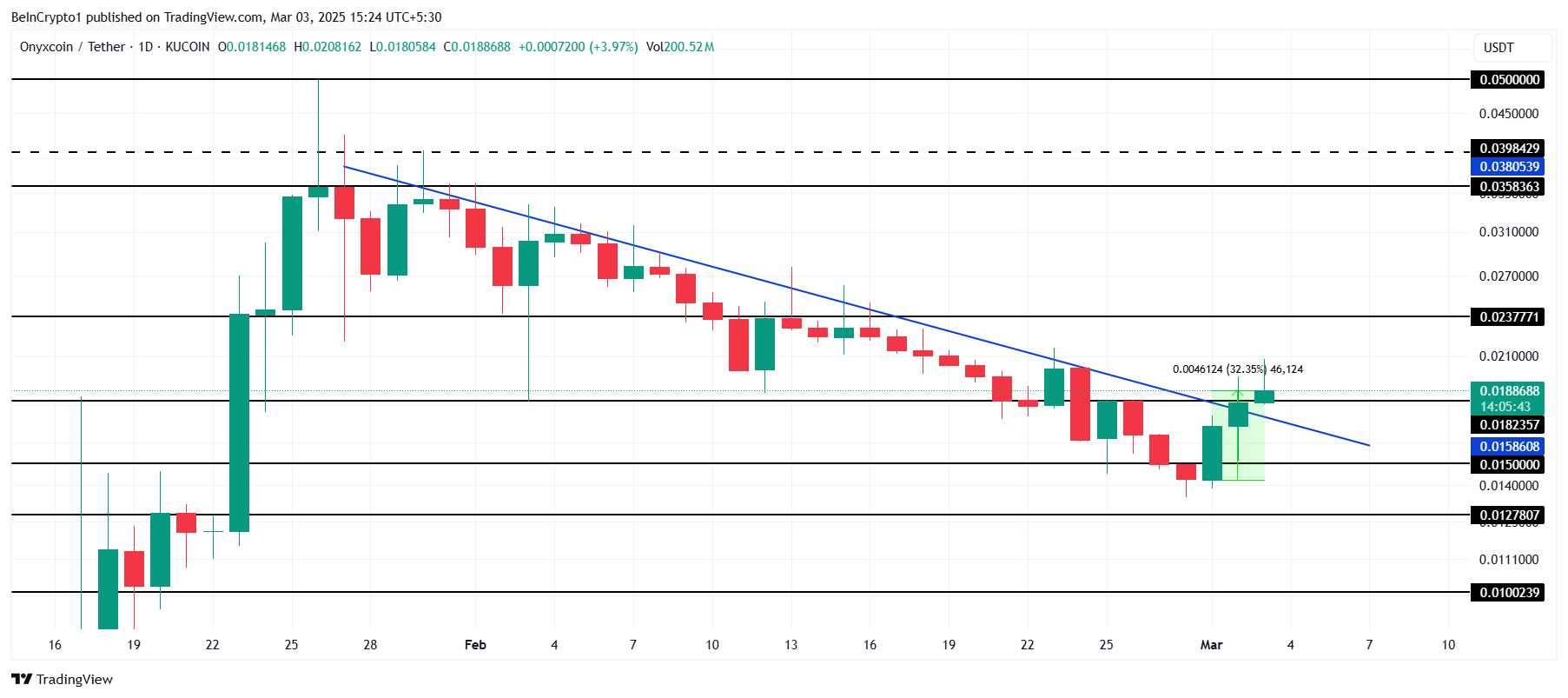 XCN è pronto per un aggiornamento significativo oggi, con il lancio della Mainnet Goliath di Onyxcoin il 3 marzo. Questo evento molto atteso potrebbe agire come un catalizzatore per un aumento del prezzo. Gli aggiornamenti della rete spesso attraggono l’interesse degli investitori, e questo sviluppo potrebbe rafforzare il sentimento rialzista, guidando ulteriore slancio per l’altcoin.